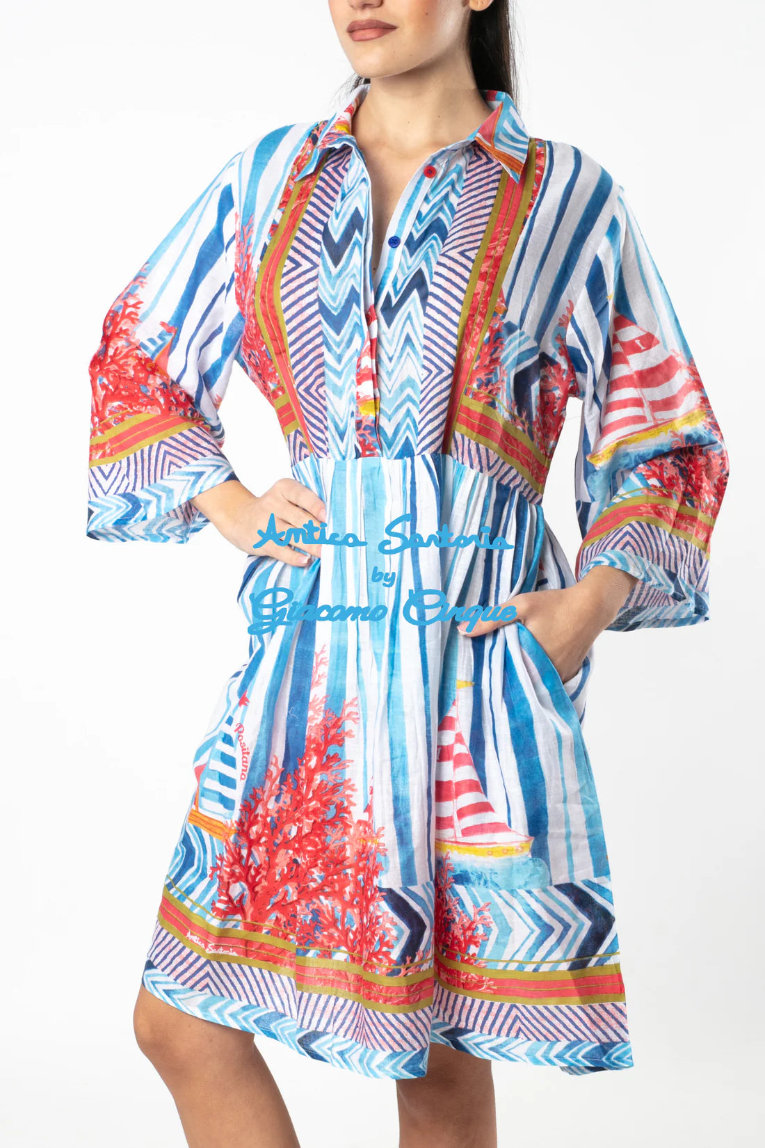 Experience coastal elegance. Inspired by Positano beachwear, this short dress features lively prints that evoke the sea and Mediterranean nature. The wide sleeves and versatile design offer a chic and relaxed look, perfect for summer.