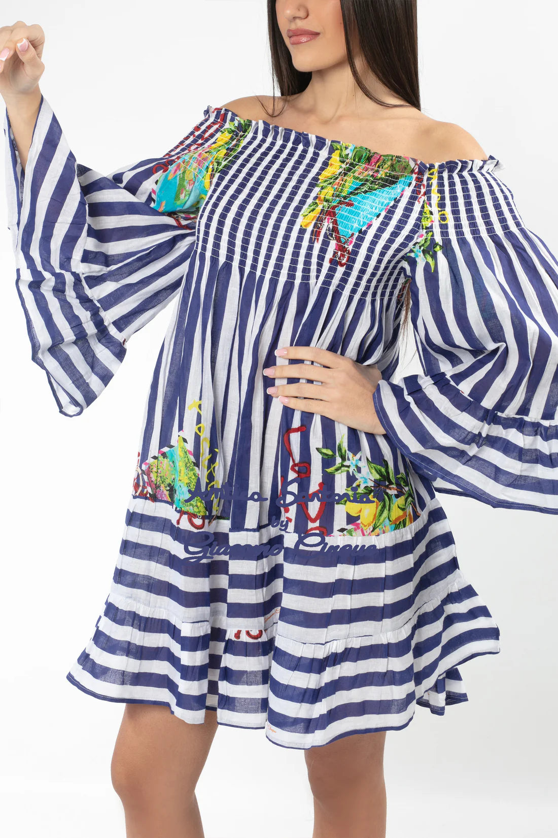 This Short Sleeveless Dress is the epitome of Positano beachwear. Its off-the-shoulder design and wide sleeves add a feminine touch and effortless elegance, making it the perfect choice for summer days. Versatile and timeless, it is ideal for beach strolls and evening drinks. A must-have for any beachwear collection.