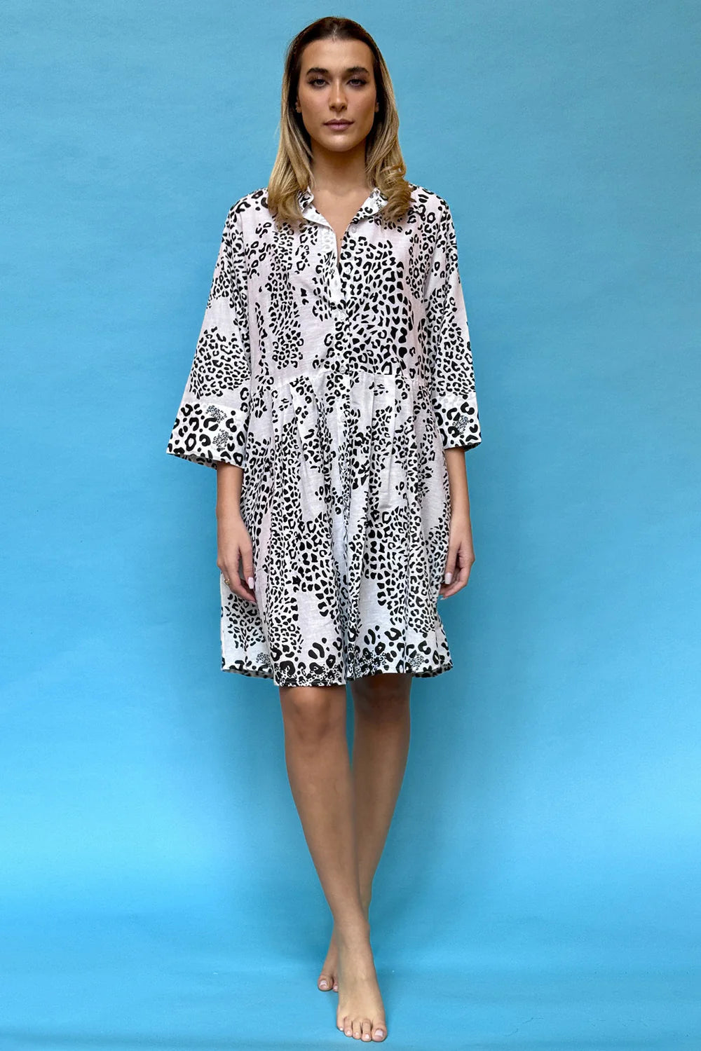 This 100% cotton dress features an open front design, perfect for those who desire ease and versatility in their clothing. The abstract animalier theme adds a touch of trendiness to this comfortable and practical piece. Experience effortless style with the dress open at the front.