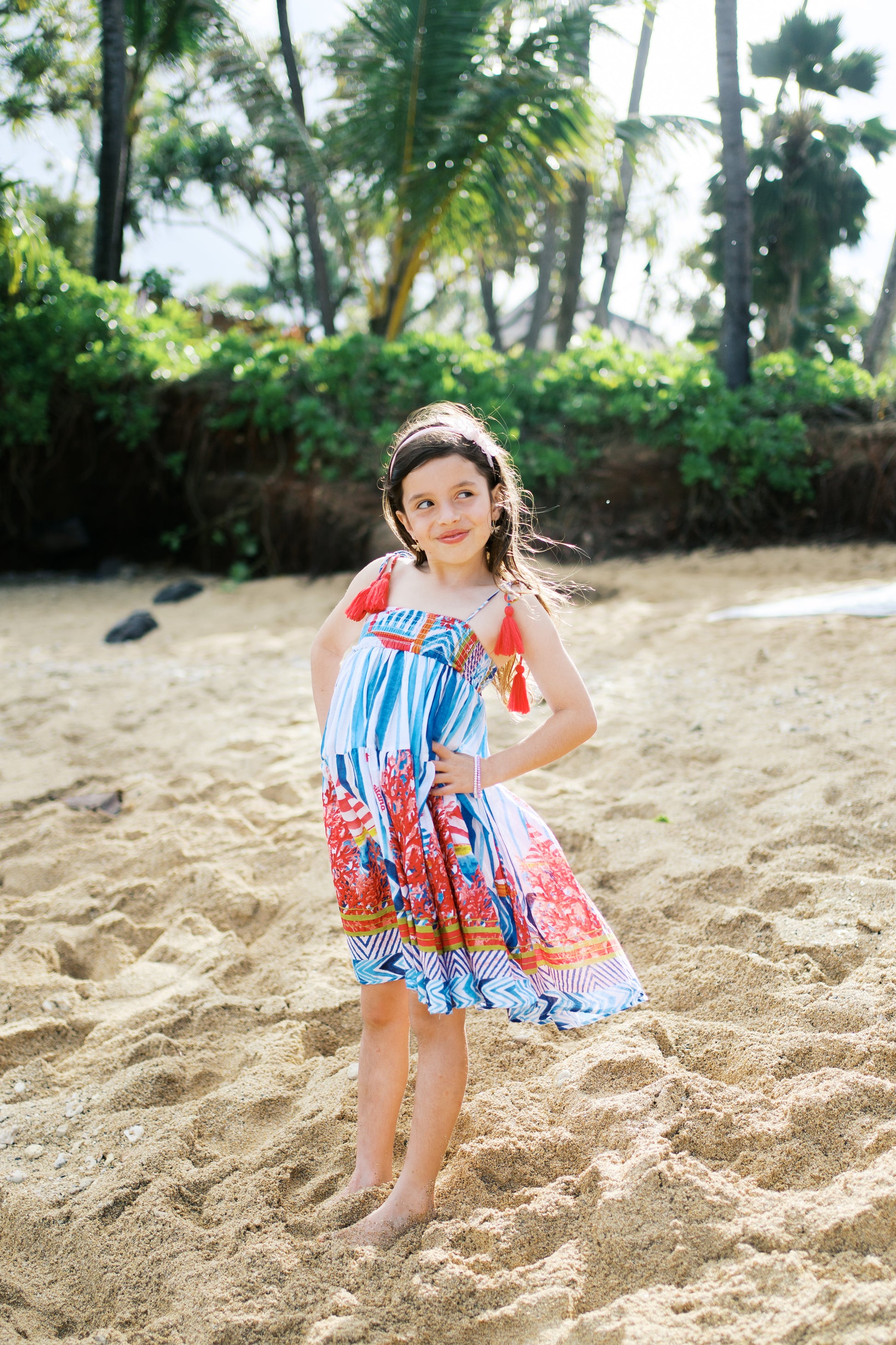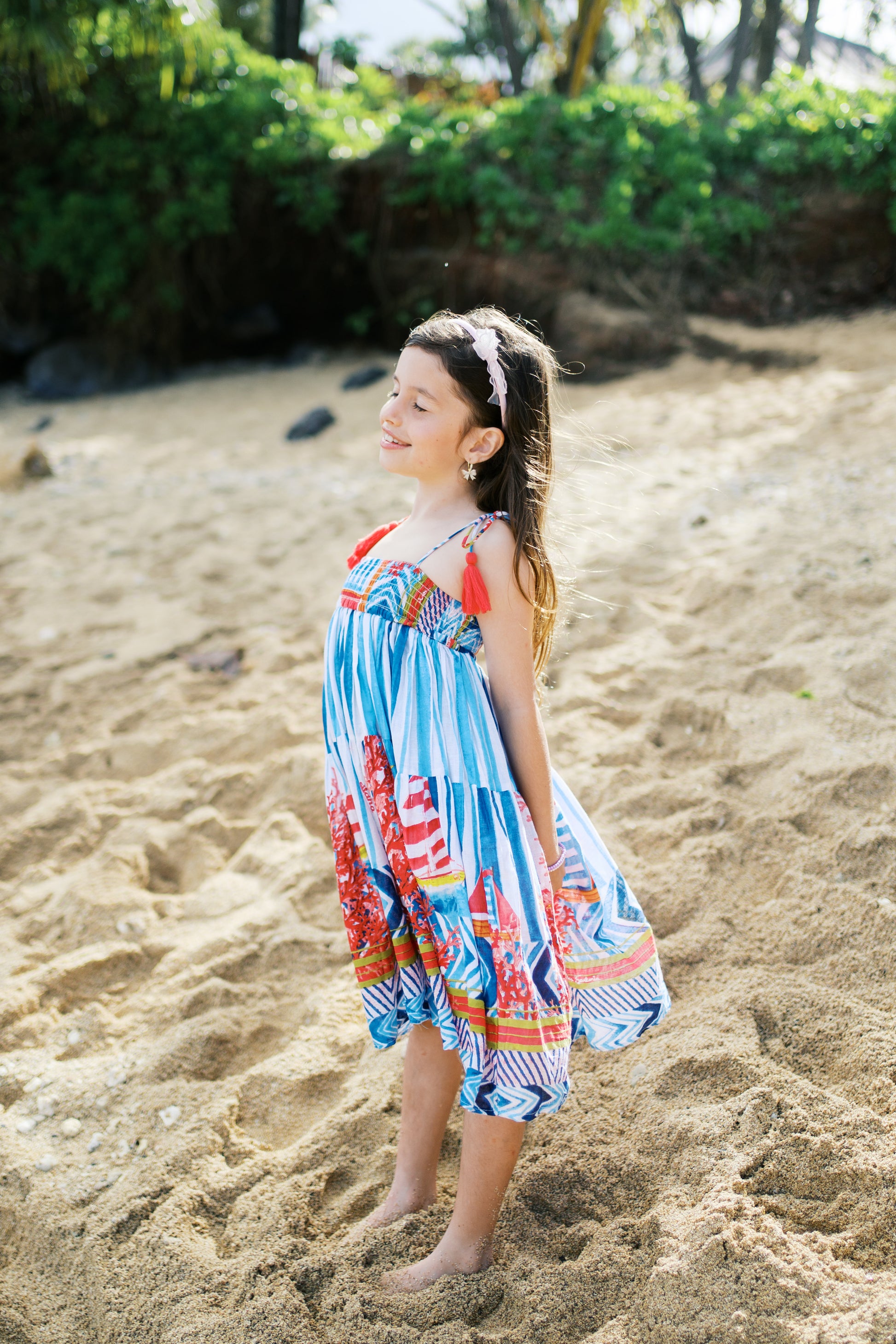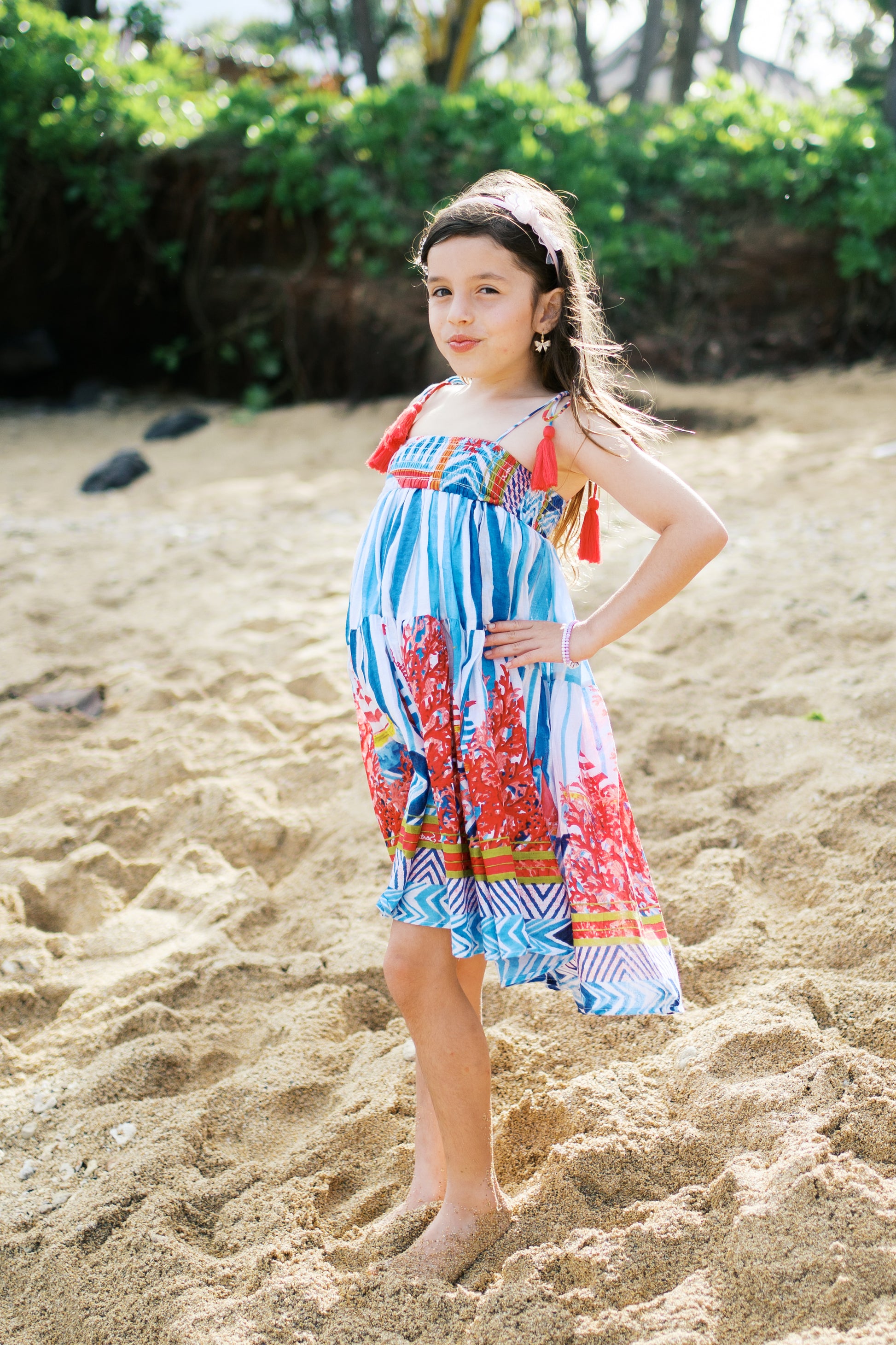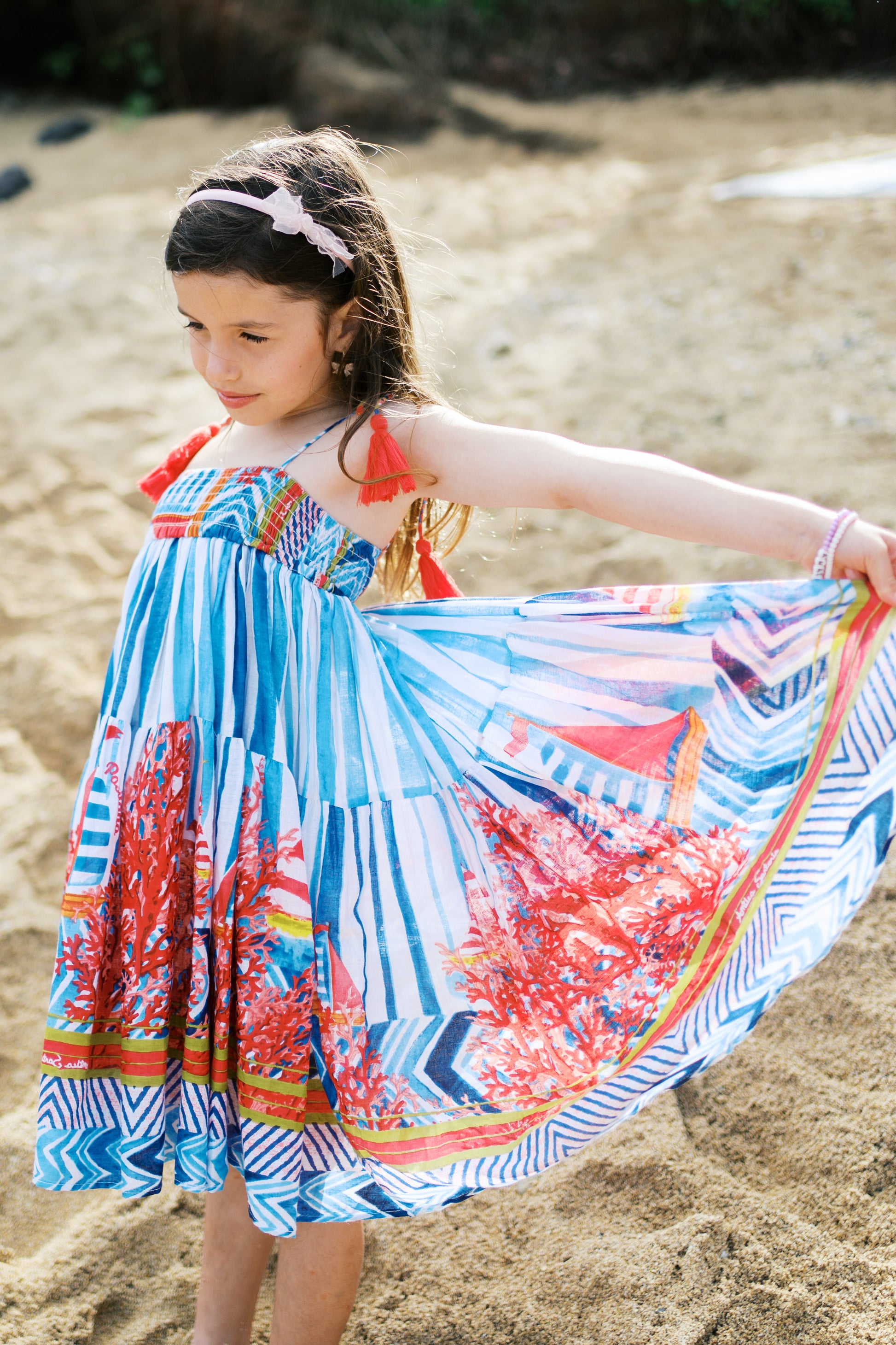 This playful and stylish little girl's dress. With adjustable thin straps and decorative tassels, this dress is perfect for summer days outdoors or walks along the seafront. Featuring marine motifs and references to Positano fashion, it's a must-have for fashion-forward little girls.