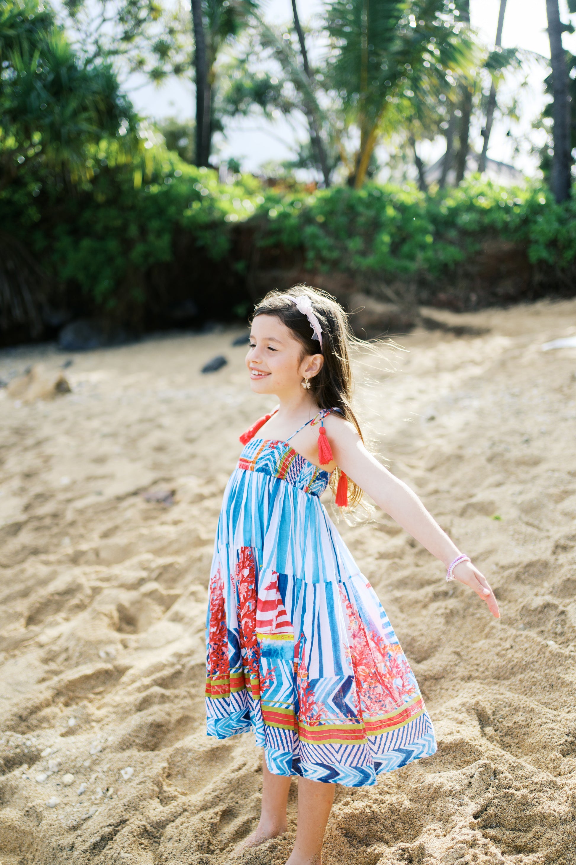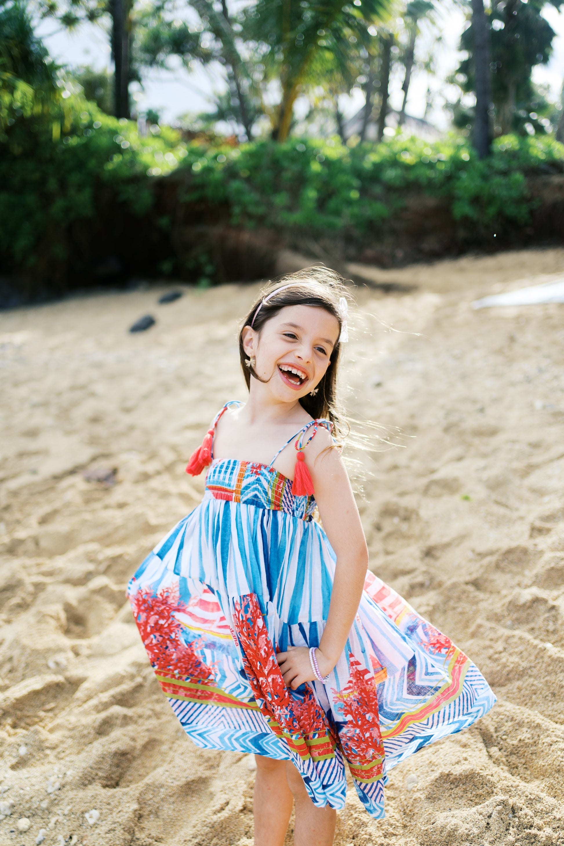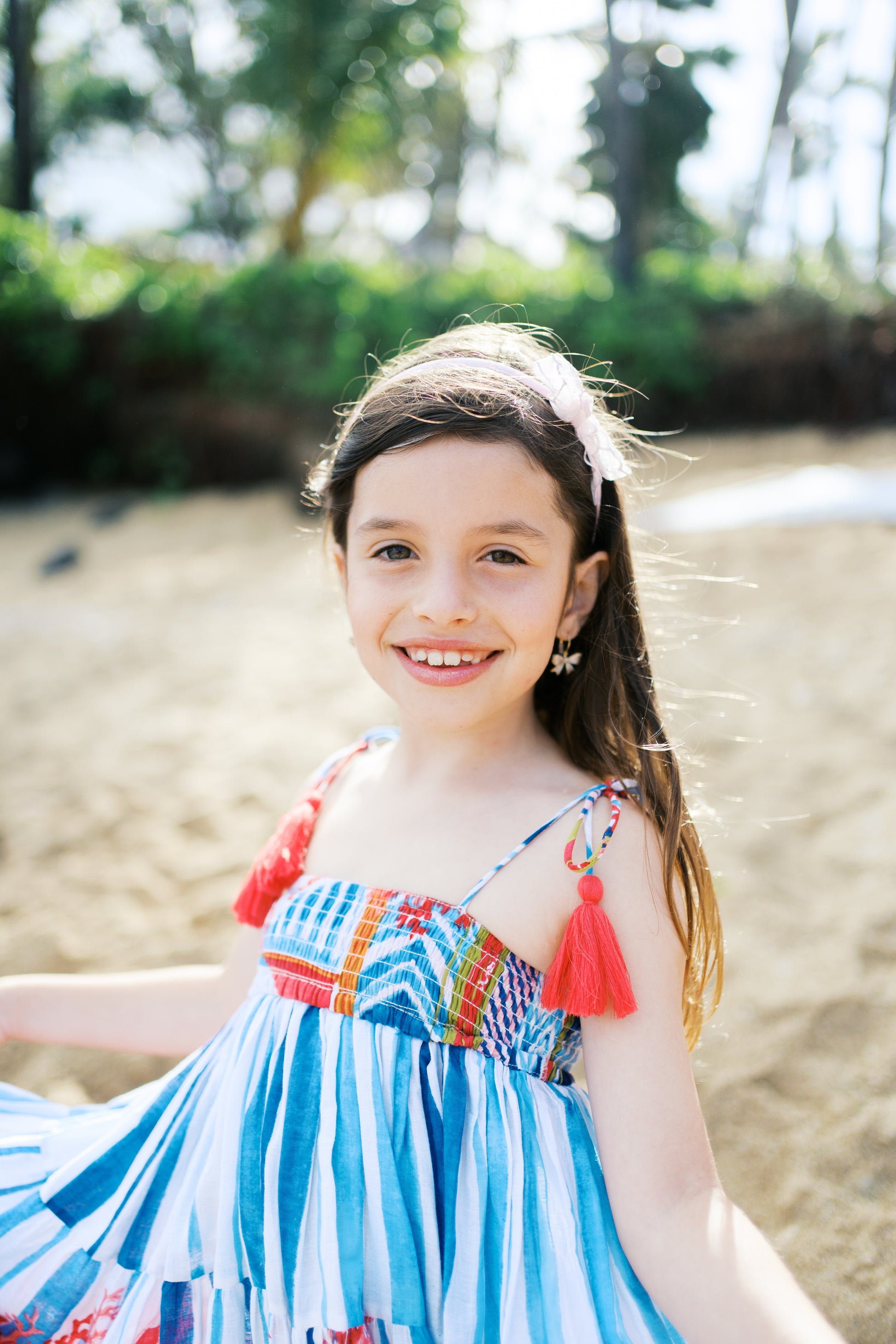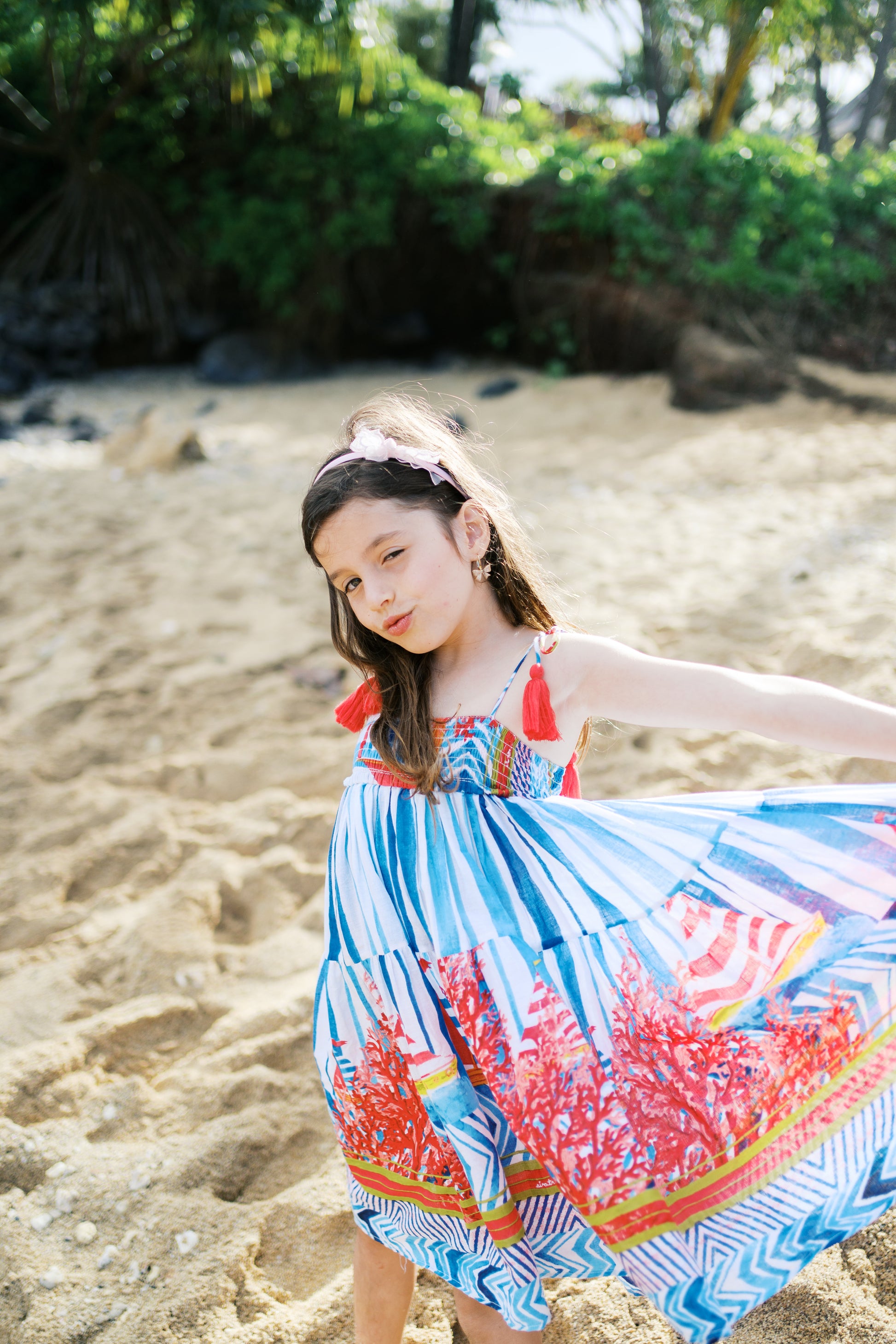 This playful and stylish little girl's dress. With adjustable thin straps and decorative tassels, this dress is perfect for summer days outdoors or walks along the seafront. Featuring marine motifs and references to Positano fashion, it's a must-have for fashion-forward little girls.