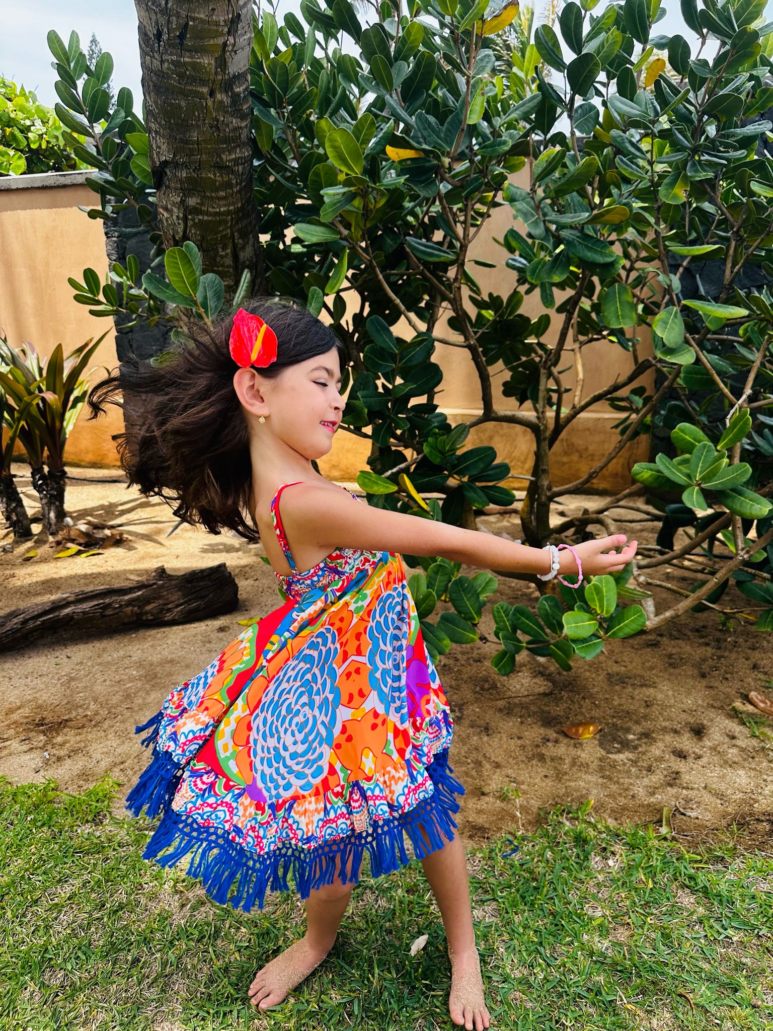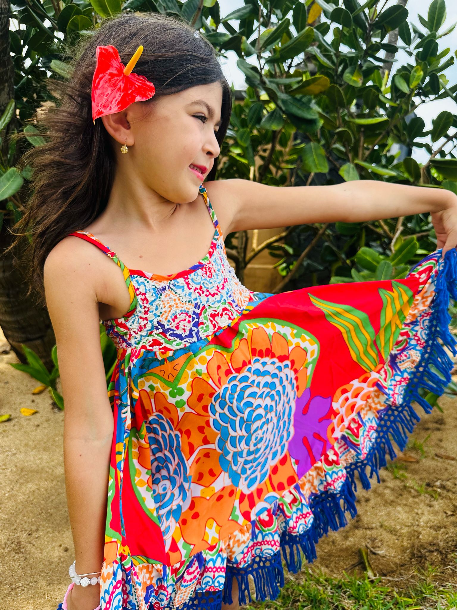 The baby dress offers a playful and comfortable outfit for summer fun. Featuring an Optical printing design with cheerful, colorful motifs, a flared and handcrafted bodice, and a Boho-inspired hem, this dress is perfect for beach days or relaxing moments. With multiple color variants.