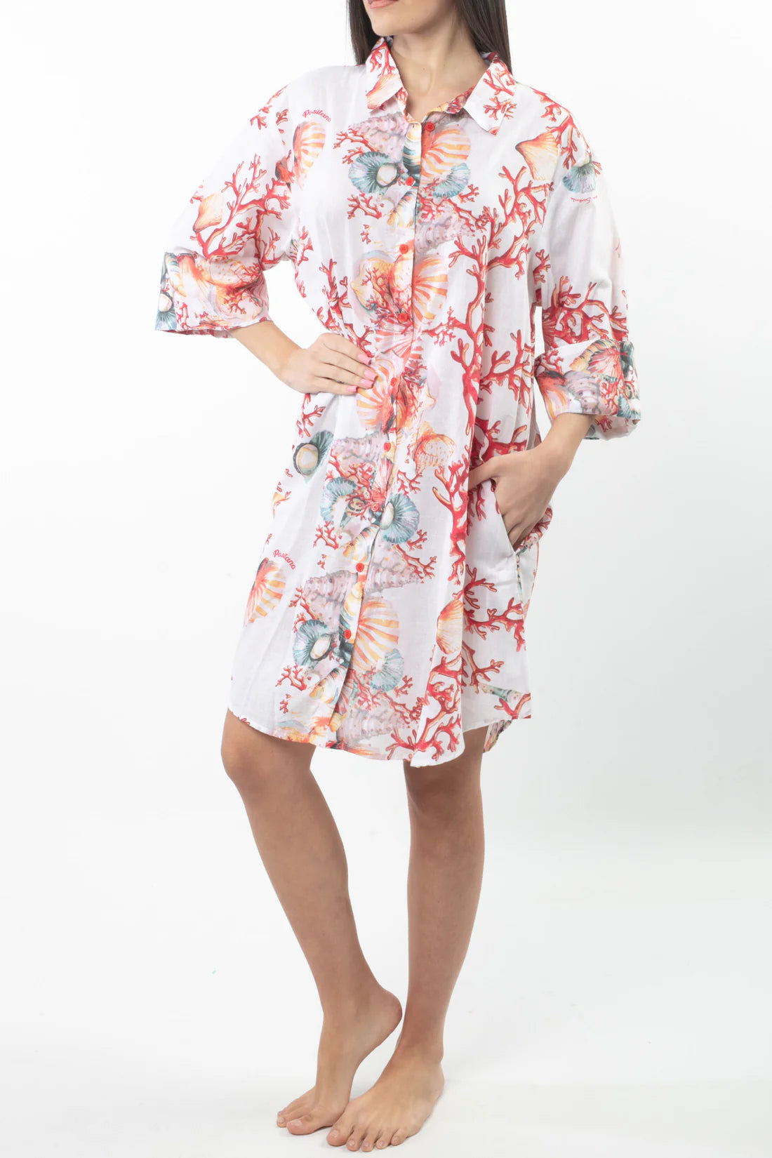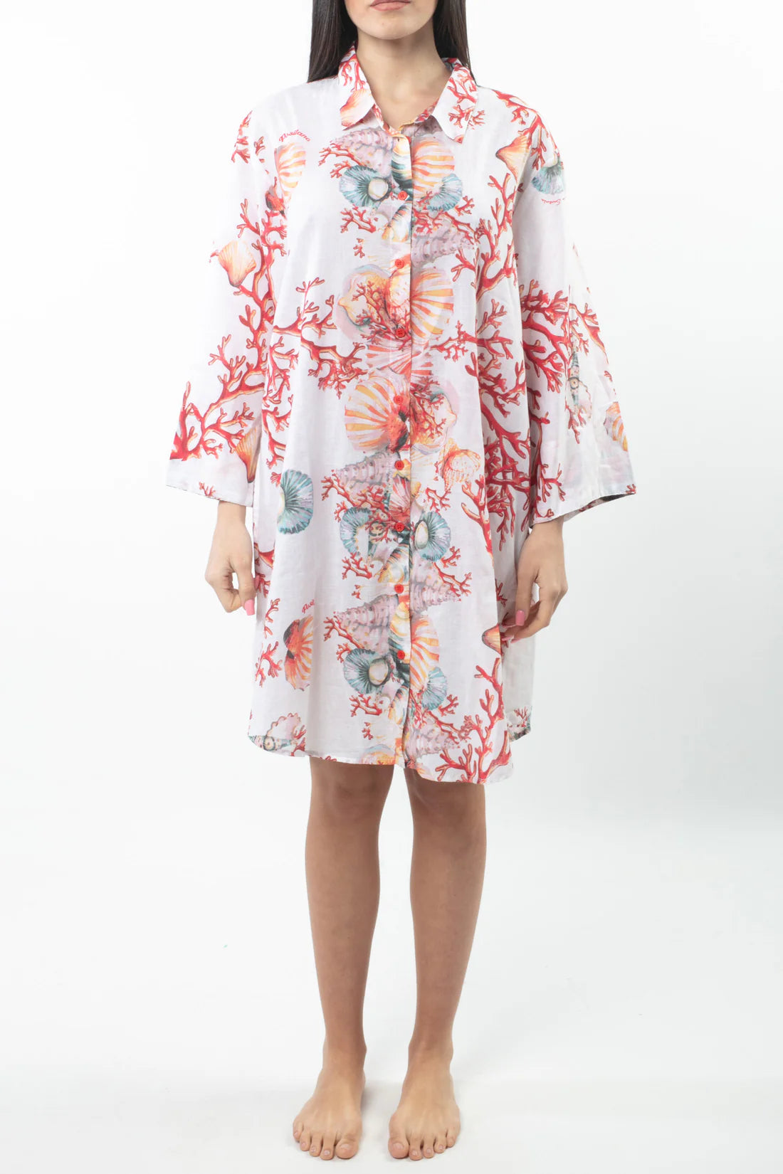 Introducing the open-front dress - your new must-have for the beach or a casual-chic look. The soft and fluid cut offers comfort, while the elegant decorative band and coral embellishments add a touch of sophistication. Perfect for those who appreciate the refined style of the Amalfi Coast.