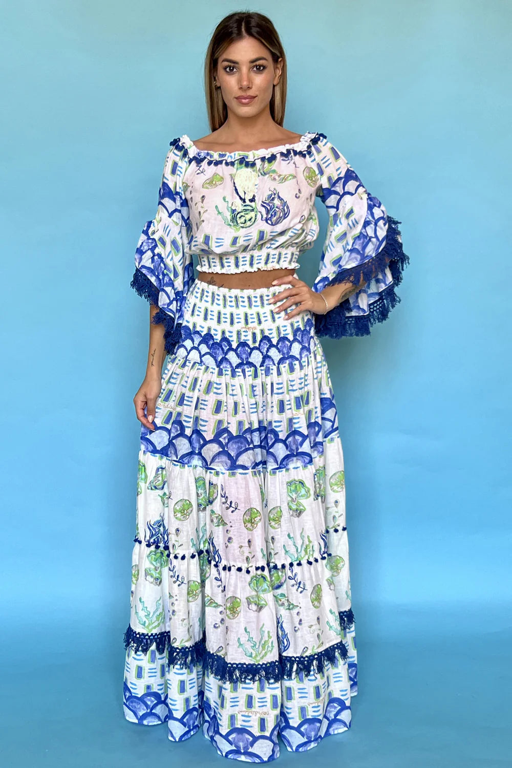 This gypsy skirt is made from 100% cotton by the brand SEA. It features a unique marine theme, making it perfect for bohemian, beachy looks. Stay comfortable and stylish in this flowy and breathable skirt.