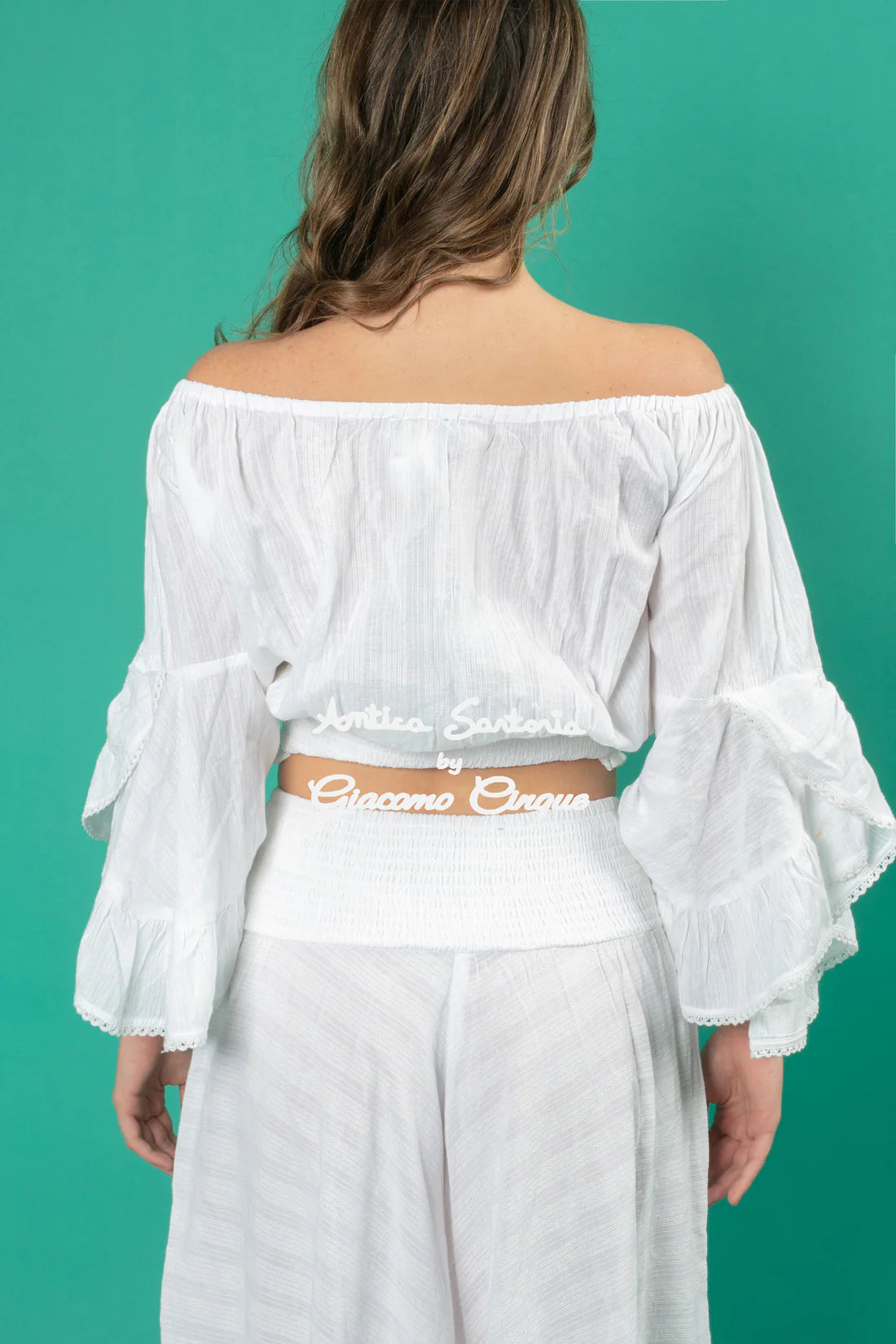 Introducing Top, This off-the-shoulder top features wide, voluminous sleeves and delicate lace details. The center lace with tassels adds a boho-chic touch, while the front embroidery adds elegance. This light, breathable fabric makes this top perfect for a fresh and refined summer look. Expertly crafted for the stylish and sophisticated.